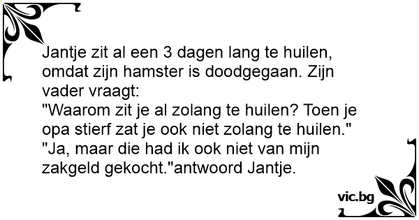 Jantje zit al een 3 dagen lang te huilen, omdat zijn hamster is doodgegaan. Zijn vader vraagt: