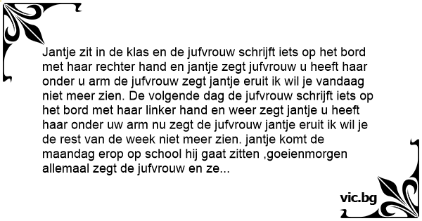 Jantje zit in de klas en de jufvrouw schrijft iets op het bord met haar rechter hand en jantje zegt jufvrouw u heeft haar onder u arm de jufvrouw zegt jantje eruit ik wil je vandaag niet meer zien. De volgende dag de jufvrouw schrijft iets op het bord met haar linker hand en weer zegt jantje u heeft haar onder uw arm nu zegt de jufvrouw jantje eruit ik wil je de rest van de week niet meer zien. jantje komt de maandag erop op school hij gaat zitten ,goeienmorgen allemaal zegt de jufvrouw en ze pakt een krijtje en wil beginnen te schrijven maar ze laat het krijtje vallen ze bukt om het krijtje op te pakken en jantje steekt zijn vinger op en de juf zegt zeg het maar jantje en jantje zegt tot de volgende kerst- vakantie juf