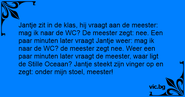 Jantje zit in de klas, hij vraagt aan de meester: mag ik naar de WC? De meester zegt: nee. Een paar minuten later vraagt Jantje weer: mag ik naar de WC? de meester zegt nee. Weer een paar minuten later vraagt de meester, waar ligt de Stille Oceaan? Jantje steekt zijn vinger op en zegt: onder mijn stoel, meester!