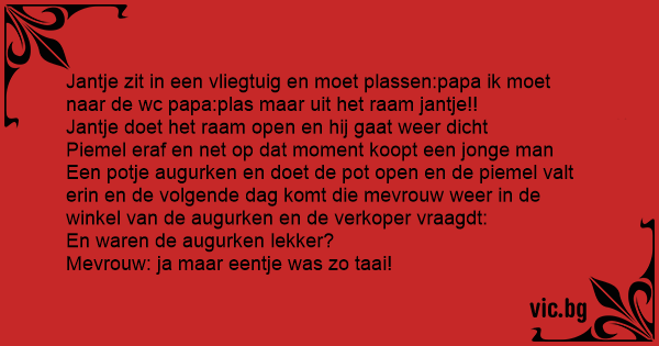 Jantje zit in een vliegtuig en moet plassen:papa ik moet naar de wc papa:plas maar uit het raam jantje!!