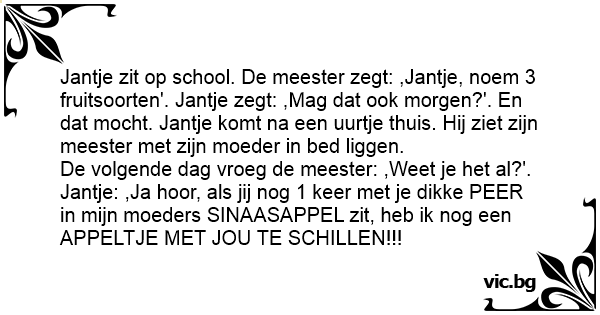 Jantje zit op school. De meester zegt: ,Jantje, noem 3 fruitsoorten'. Jantje zegt: ,Mag dat ook morgen?'. En dat mocht. Jantje komt na een uurtje thuis. Hij ziet zijn meester met zijn moeder in bed liggen.