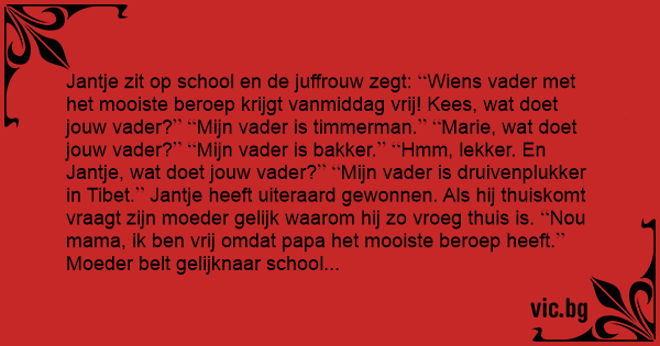 Jantje zit op school en de juffrouw zegt: Wiens vader met het mooiste beroep krijgt vanmiddag vrij! Kees, wat doet jouw vader? Mijn vader is timmerman. Marie, wat doet jouw vader? Mijn vader is bakker. Hmm, lekker. En Jantje, wat doet jouw vader? Mijn vader is druivenplukker in Tibet. Jantje heeft uiteraard gewonnen. Als hij thuiskomt vraagt zijn moeder gelijk waarom hij zo vroeg thuis is. Nou mama, ik ben vrij omdat papa het mooiste beroep heeft. Moeder belt gelijknaar school en vraagt aan de juffrouw waarom Jantje naar huis mocht. Zegt de juffrouw: Uw man heeft het mooiste beroep, druivenplukker in Tibet. Ik denk dat hij het verkeerd verstaan heeft, zegt moeder, want hij zit namelijk met een druiper in de ziektewet!
