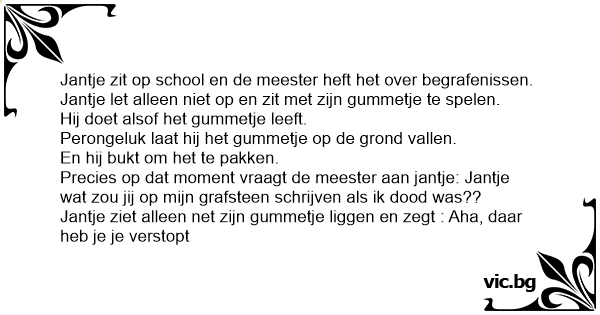 Precies op dat moment vraagt de meester aan jantje: Jantje wat zou jij op mijn grafsteen schrijven als ik dood was??