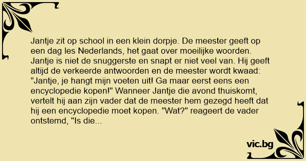 "Jantje, je hangt mijn voeten uit! Ga maar eerst eens een encyclopedie kopen!" Wanneer Jantje die avond thuiskomt, vertelt hij aan zijn vader dat de meester hem gezegd heeft dat hij een encyclopedie moet kopen. "Wat?" reageert de vader ontstemd, "Is die vent op zijn hoofd gevallen? Ga jij maar gewoon op je fiets naar school, zoals alle andere jongens!"