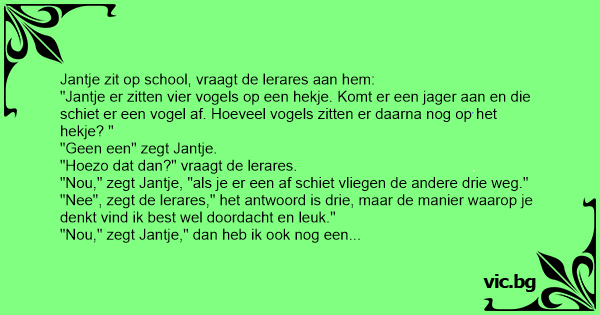 Het is tijd voor de rekenles en de juffrouw vraagt aan Jantje: "Er zitten 6 vogels op een hek, een jager schier er 2 dood hoeveel vogels blijven er over?" "Geen één juffrouw, de anderen vliegen...
