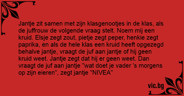 Jantje zit samen met zijn klasgenootjes in de klas, als de juffrouw de volgende vraag stelt. Noem mij een kruid. Elsje zegt zout, pietje zegt peper, henkie zegt paprika, en als de hele klas een kruid heeft opgezegd behalve jantje, vraagt de juf aan jantje of hij geen kruid weet. Jantje zegt dat hij er geen weet. Dan vraagt de juf aan jantje "wat doet je vader 's morgens op zijn eieren", zegt jantje "NIVEA"