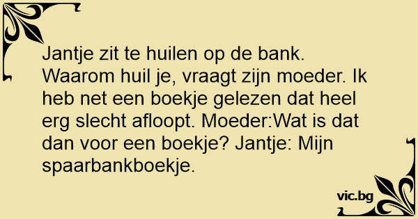 Jantje zit te huilen op de bank. Waarom huil je, vraagt zijn moeder. Ik heb net een boekje gelezen dat heel erg slecht afloopt. Moeder:Wat is dat dan voor een boekje? Jantje: Mijn spaarbankboekje.