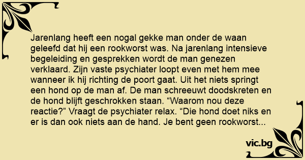 Jarenlang heeft een nogal gekke man onder de waan geleefd dat hij een rookworst was. Na jarenlang intensieve begeleiding en gesprekken wordt de man genezen verklaard. Zijn vaste psychiater loopt even met hem mee wanneer ik hij richting de poort gaat. Uit het niets springt een hond op de man af. De man schreeuwt doodskreten en de hond blijft geschrokken staan. “Waarom nou deze reactie?” Vraagt de psychiater relax. “Die hond doet niks en er is dan ook niets aan de hand. Je веnт geen rookworst meer, weet je nog!”