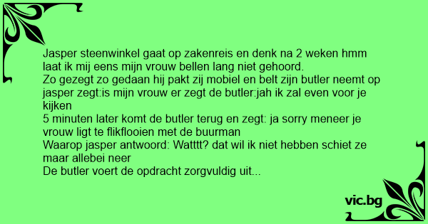 5 minuten later komt de butler terug en zegt: ja sorry meneer je vrouw ligt te flikflooien met de buurman