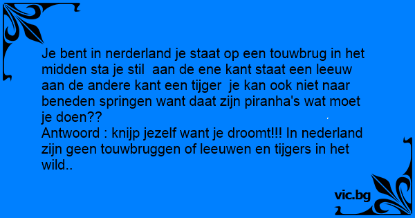Antwoord : knijp jezelf want je droomt!!! In nederland zijn geen touwbruggen of leeuwen en tijgers in het wild..