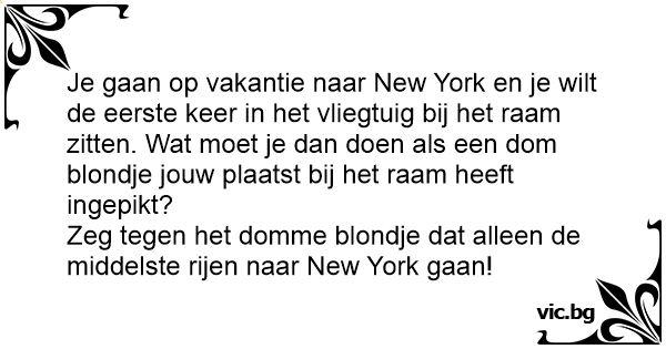 Je gaan op vakantie naar New York en je wilt de eerste keer in het vliegtuig bij het raam zitten. Wat moet je dan doen als een dom blondje jouw plaatst bij het raam heeft ingepikt?