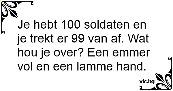 Je hebt 100 soldaten en je trekt er 99 van af. Wat hou je over? Een emmer vol en een lamme hand.