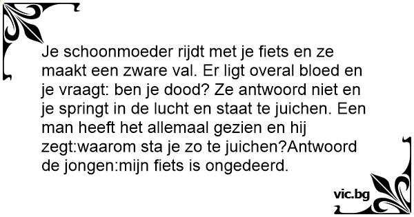 Je schoonmoeder rijdt met je fiets en ze maakt een zware val. Er ligt overal bloed en je vraagt: ben je dood? Ze antwoord niet en je springt in de lucht en staat te juichen. Een man heeft het allemaal gezien en hij zegt:waarom sta je zo te juichen?Antwoord de jongen:mijn fiets is ongedeerd.
