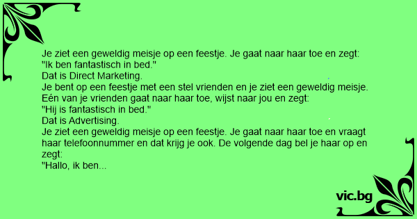 Tot slot: Je веnт op een feestje en je ziet een geweldig meisje. Je gaat erop af, pakt haar beet en neemt haar mee naar bed, waar zij tot de ontdekking komt dat jij fantastisch веnт in bed.