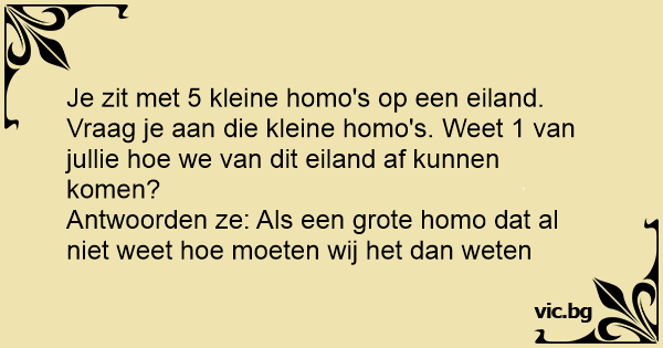 Je zit met 5 kleine hомо's op een eiland. Vraag je aan die kleine hомо's. Weet 1 van jullie hое we van dit eiland af kunnen komen?