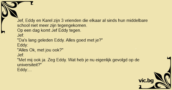 "Met mij ook ja. Zeg Eddy. Wat heb je nu eigenlijk gevolgd op de universiteit?"