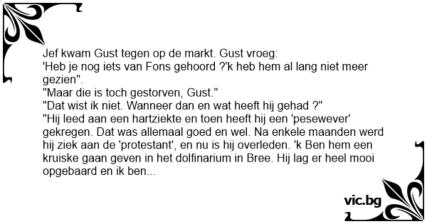 "Hij leed aan een hartziekte en toen heeft hij een 'pesewever' gekregen. Dat was allemaal goed en wel. Na enkele maanden werd hij ziek aan de 'protestant', en nu is hij overleden. 'k Ben hem een kruiske gaan geven in het dolfinarium in Bree. Hij lag er heel mooi opgebaard en ik ben ook naar de begrafenis geweest. De pastoor heeft een mooie homofilie gehouden over hem. Na de viering werd hij niet op het kerkhof begraven. Ze brachten hem dan naar de crèmerie in Hasselt. Daar werd hij dan gekarameliseerd tot hij in een klein potteke paste!