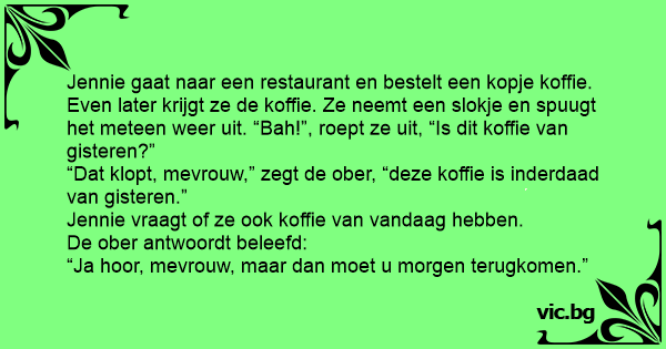 “Dat klopt, mevrouw,” zegt de ober, “deze koffie is inderdaad van gisteren.”