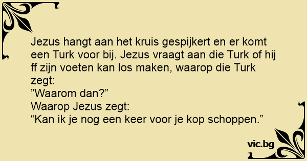 Jezus hangt aan het kruis gespijkert en er komt een Turk voor bij. Jezus vraagt aan die Turk of hij ff zijn voeten kan los maken, waarop die Turk zegt: