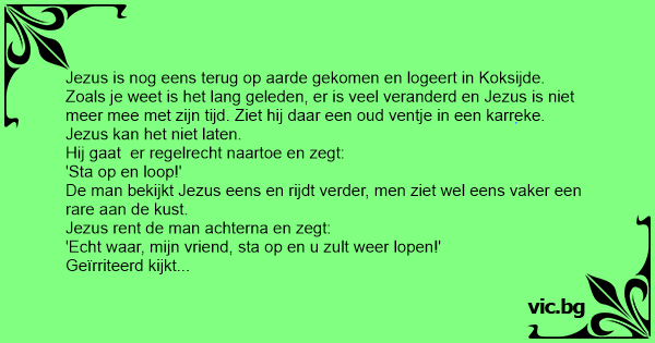 Zoals je weet is het lang geleden, er is veel veranderd en Jezus is niet meer mee met zijn tijd. Ziet hij daar een oud ventje in een karreke. Jezus kan het niet laten.