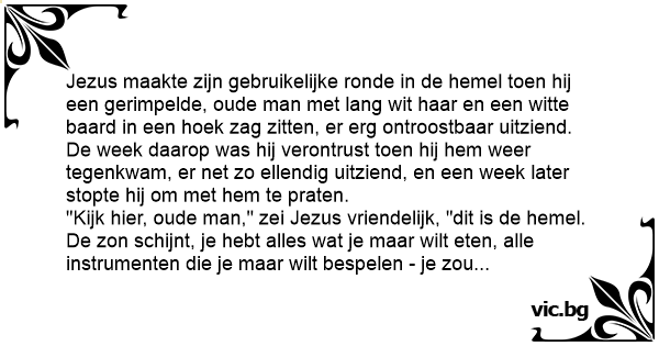 Jezus maakte zijn gebruikelijke ronde in de hemel toen hij een gerimpelde, oude man met lang wit haar en een witte baard in een hoek zag zitten, er erg ontroostbaar uitziend.