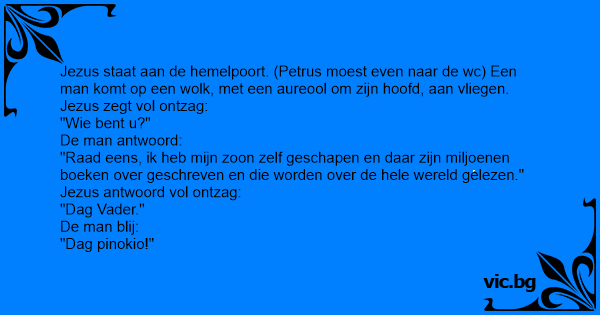 Jezus staat aan de hemelpoort. (Petrus moest even naar de wc) Een man komt op een wolk, met een aureool om zijn hoofd, aan vliegen. Jezus zegt vol ontzag: