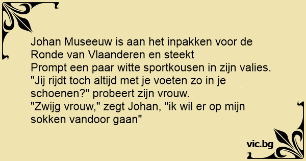 Johan Museeuw is aan het inpakken voor de Ronde van Vlaanderen en steekt Prompt een paar witte sportkousen in zijn valies. "Jij rijdt toch altijd met je voeten zo in je schoenen?" probeert zijn vrouw. "Zwijg vrouw," zegt Johan, "ik wil er op mijn sokken vandoor gaan"