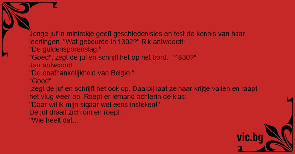Er komt een nieuwe jonge lerares van 18 met een kort rokje aan in groep 5 binnen en zegt: 'Nou kinderen, we beginnen met geschiedenis, wil dat jongetje naar voren komen, dan stel ik een vraag aan...