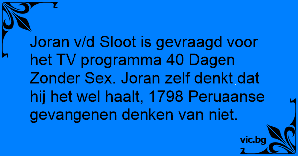 Joran v/d Sloot is gevraagd voor het TV programma 40 Dagen Zonder Sеx. Joran zelf denkt dat hij het wel haalt, 1798 Peruaanse gevangenen denken van niet.