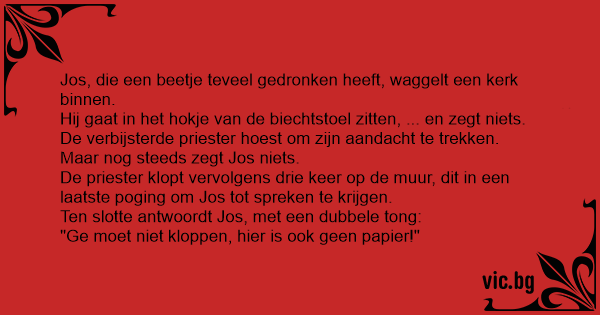 En half dronken man komt toegestroomd in de kerk en gaat in een biechtkamer. Enkele minuten later komt de pastoor bij hem zitten en wacht... maar hij krijgt geen antwoord. De pastoor klopt even...
