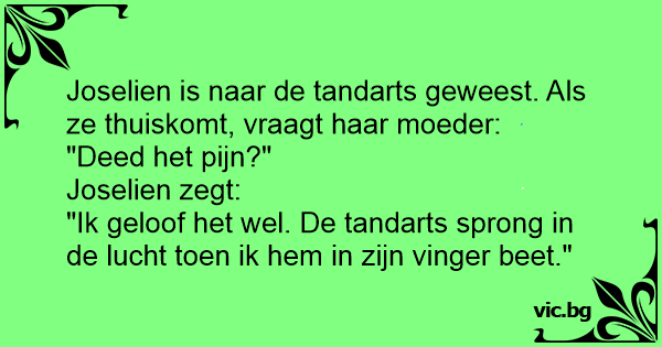 Mama: "Heb je niet geweent bij de tandarts." Jantje: "Nee mama de tandarts heeft geweent." Mama: "Waarom heeft de tandarts geweent." Jantje: "Omdat ik in zijn vinger heb gebeten."