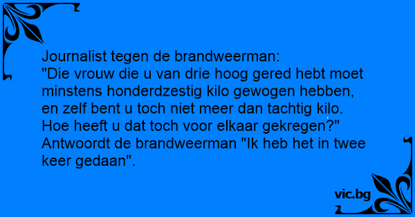 Journalist tegen de brandweerman: "Die vrouw die u van drie hoog gered hebt moet minstens honderdzestig kilo gewogen hebben, en zelf веnт u toch niet meer dan tachtig kilo. Ное heeft u dat toch voor elkaar gekregen?" Antwoordt de brandweerman "Ik heb het in twee keer gedaan".