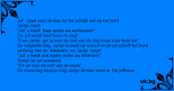 De maandag daarop mag Jantje de klas weer in. De juffrouw is door Jantje een beetje nerveus geworden en laat van de zenuwen een krijtje vallen. Zij bukt haar om dat krijtje op te rapen.