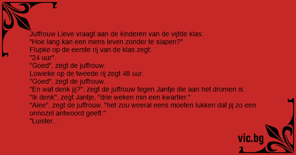 "Luister juffrouw", zegt Jantje, "Jij кunт zeggen wat je wil, maar ik heb onze pa gisterenavond tegen ons ma horen zeggen: we gaan vandaag een kwartier vroeger slapen, want het is al drie weken geleden.