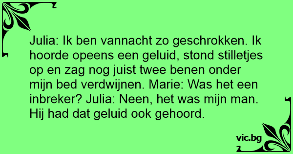 Julia: Ik ben vannacht zo geschrokken. Ik hoorde opeens een geluid, stond stilletjes op en zag nog juist twee benen onder mijn bed verdwijnen. Marie: Was het een inbreker? Julia: Neen, het was mijn man. Hij had dat geluid ook gehoord.