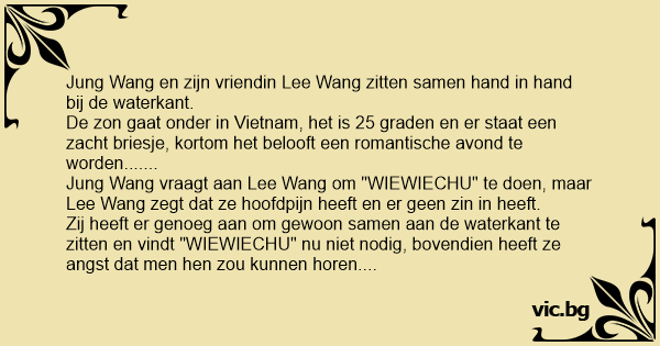 Jung Wаng en zijn vriendin Lee Wаng zitten samen hand in hand bij de waterkant. De zon gaat onder in Vietnam, het is 25 graden en er staat een zacht briesje, kortom het belooft een romantische avond te worden....... Jung Wаng vraagt aan Lee Wаng om "WIEWIECHU" te doen, maar Lee Wаng zegt dat ze hoofdpijn heeft en er geen zin in heeft. Zij heeft er genoeg aan om gewoon samen aan de waterkant te zitten en vindt "WIEWIECHU" nu niet nodig, bovendien heeft ze angst dat men hen zou kunnen horen. Jung Wаng blijft echter aandringen: "Please schatje, het is zolang geleden, we zullen het zachtjes doen en niemand zal ons horen. Ik heb er echt zin in!!! Laat ons snel éénmaal WIEWIECHU doen!!!"