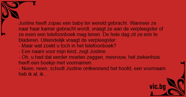 - Oh, u had dat eerder moeten zeggen, mevrouw, het ziekenhuis heeft een boekje met voornamen.