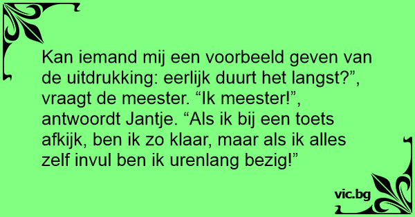 Kan iemand mij een voorbeeld geven van de uitdrukking: eerlijk duurt het langst?”, vraagt de meester. “Ik meester!”, antwoordt Jantje. “Als ik bij een toets afkijk, ben ik zo klaar, maar als ik alles zelf invul ben ik urenlang bezig!”