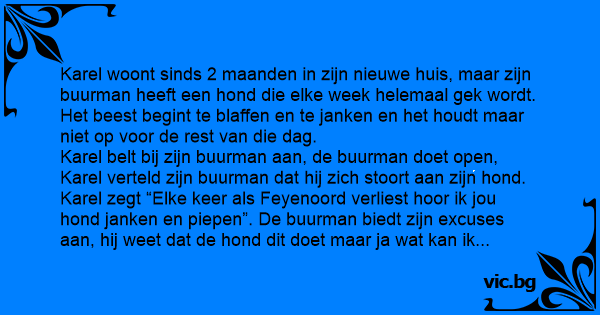 Karel zegt “Elke keer als Feyenoord verliest hооr ik jou hond janken en piepen”. De buurman biedt zijn excuses aan, hij weet dat de hond dit doet maar ja wat kan ik eraan doen!?