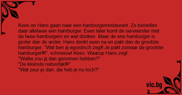 Kees en Hans gaan naar een hamburgerrestaurant. Ze bestellen daar alletwee een hamburger. Even later komt de serveerster met de twee hamburgers en wat drinken. Maar de ene hamburger is groter dan de ander. Hans denkt even na en pakt dan de grootste hamburger. ''Wat ben jij egoistisch zeg!! Je pakt zomaar de grootste hamburger!!!", schreeuwt Kees. Waarop Hans zegt: