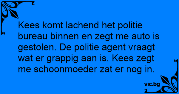 Kees komt lachend het politie bureau binnen en zegt me auto is gestolen. De politie agent vraagt wat er grappig aan is. Kees zegt me schoonmoeder zat er nog in.