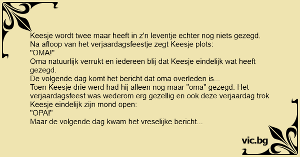 Toen Keesje drie werd had hij alleen nog maar "oma" gezegd. Het verjaardagsfeest was wederom erg gezellig en ook deze verjaardag trok Keesje eindelijk zijn mond open: