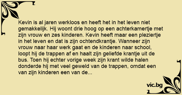 Kevin is al jaren werkloos en heeft het in het leven niet gemakkelijk. Hij woont drie hoog op een achterkamertje met zijn vrouw en zes kinderen. Kevin heeft maar een pleziertje in het leven en dat is zijn ochtendkrantje. Wanneer zijn vrouw naar haar werk gaat en de kinderen naar school, loopt hij de trappen af en haalt zijn geliefde krantje uit de bus. Toen hij echter vorige week zijn krant wilde halen donderde hij met veel geweld van de trappen, omdat een van zijn kinderen een van de rolschaatsen op de trap had laten staan.