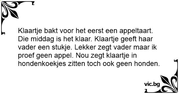 Klaartje bakt voor het eerst een appeltaart. Die middag is het klaar. Klaartje geeft haar vader een stukje. Lekker zegt vader maar ik proef geen appel. Nou zegt klaartje in hondenkoekjes zitten toch ook geen honden.