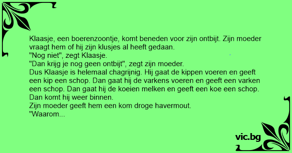 "Wel, ik zag je een kip schoppen, dus je krijgt geen eieren voor een week. En ik zag je een varken en een koe schoppen, dus krijg je ook geen spek en melk voor een week", zegt zijn moeder streng.
