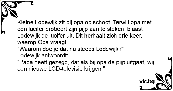 Kleine Lodewijk zit bij opa op schoot. Terwijl opa met een lucifer probeert zijn pijp aan te steken, blaast Lodewijk de lucifer uit. Dit herhaalt zich drie keer, waarop Opa vraagt: