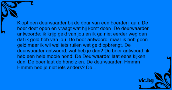 Klopt een deurwaarder bij de deur van een boerderij aan. De boer doet open en vraagt wat hij komt doen. De deurwaarder antwoorde: ik krijg geld van jou en ik ga niet eerder weg dan dat ik geld heb van jou. De boer antwoord: maar ik heb geen geld maar ik wil wel iets ruilen wat geld opbrengt. De deurwaarder antwoord: wat heb je dan? De boer antwoord: ik heb een hele mooie hond. De Deurwaarde: laat eens kijken dan. De boer laat de hond zien. De deurwaarder: Hmmm Hmmm heb je niet iets anders? De boer: dan heb ik alleen nog mijn vrouw. De deurwaarder: laat maar eens zien, waar is ze? De boer zegt: boven. De deurwaarder naar boven en komt even later weer en vraagt aan de boer: mag ik die hond nog eens een keer zien????????