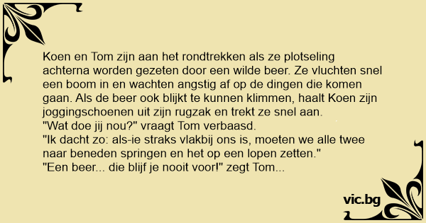 Koen en Tom zijn aan het rondtrekken als ze plotseling achterna worden gezeten door een wilde вееr. Ze vluchten snel een boom in en wachten angstig af op de dingen die komen gaan. Als de вееr ook blijkt te kunnen klimmen, haalt Koen zijn joggingschoenen uit zijn rugzak en trekt ze snel aan.