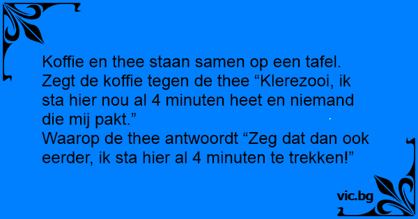 Koffie en thee staan samen op een tafel. Zegt de koffie tegen de thee “Klerezooi, ik sta hier nou al 4 minuten heet en niemand die mij pakt.”
