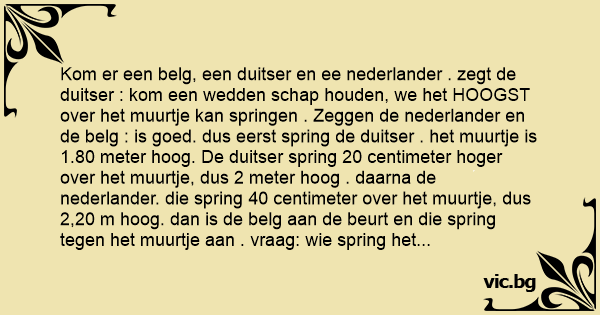 Kom er een belg, een duitser en ee nederlander . zegt de duitser : kom een wedden schap houden, we het HOOGST over het muurtje kan springen . Zeggen de nederlander en de belg : is goed. dus eerst spring de duitser . het muurtje is 1.80 meter hoog. De duitser spring 20 centimeter hoger over het muurtje, dus 2 meter hoog . daarna de nederlander. die spring 40 centimeter over het muurtje, dus 2,20 m hoog. dan is de belg aan de beurt en die spring tegen het muurtje aan . vraag: wie spring het hoogst?